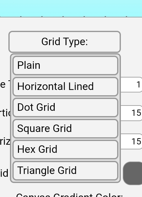 • Canvas Grid Type Options: You can set the current Book canvas grid type to Plain, Horizontal Lined, Dot Grid, or Square Grid. To change the default settings for all Books, access the App Settings Menu and change it there.